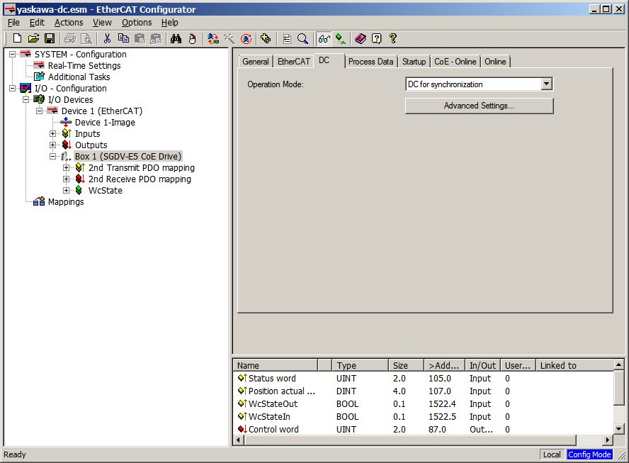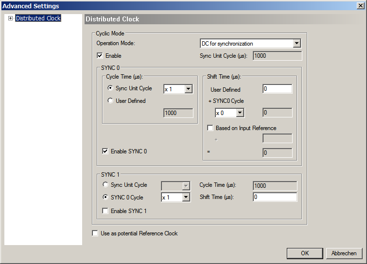 In this tab, the user can change distributed clocks related settings. The tab is only available if the device’s vendor specified the DC usage. Sync signal generation or DC latching is selected automatically according to Operation Mode.