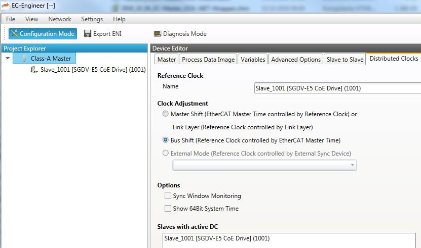 In this tab, the user can change distributed clocks related settings. The tab is only available if the configuration contains slaves.