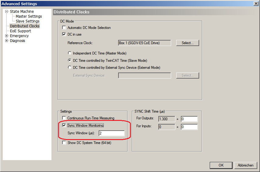 Sync Window Monitoring: A command will be inserted in the cyclic frame to read the ESC registers 0x092C. If this is selected the master will throw a notification.
