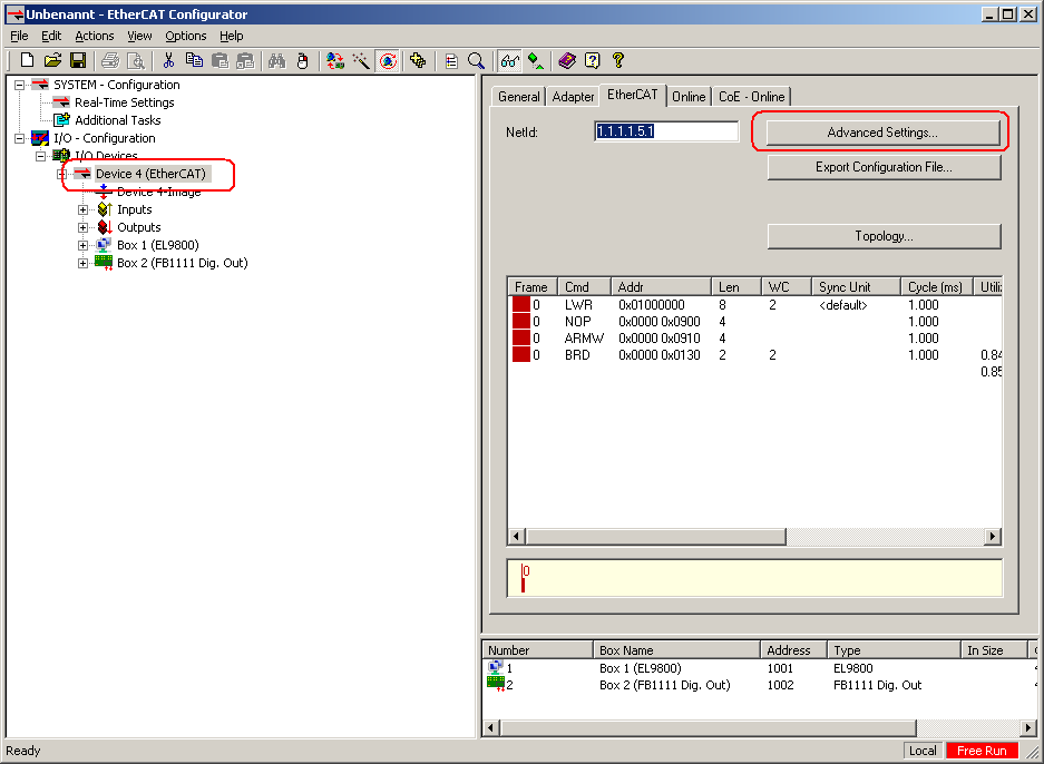 - Select the EtherCAT device and press the button “Advanced Settings…”