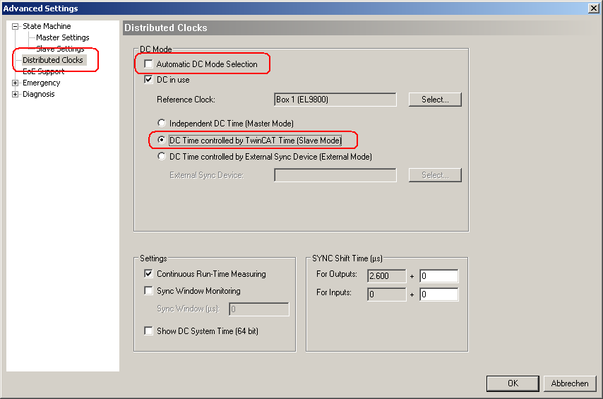 - In the open dialog please select “Distributed Clocks” on the left column. Then de-select “Automatic DC Mode Selection” and select the option “DC Time controlled by TwinCAT Time (Slave Mode)”.