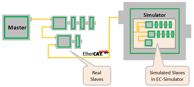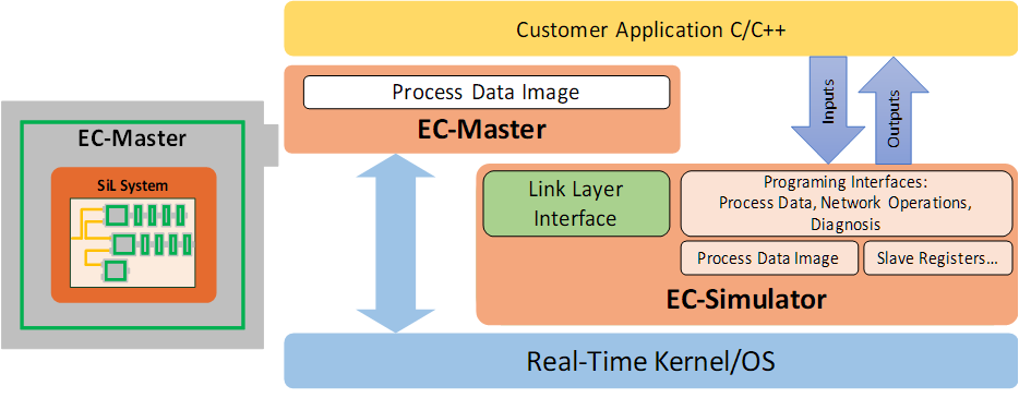The SiL Simulation Software architecture does not need a physical network interface for slave simulation. The EC-Simulator is loaded as Ethernet Driver instead to simulate the EtherCAT Network on a System controller running the EC-Master.