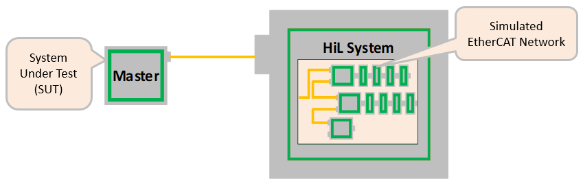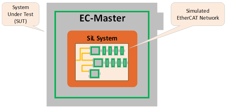 The EtherCAT network is simulated by a software running on the System Under Test (SUT). Instead of communicating with the Ethernet Controller, the EC-Master EtherCAT master is directly exchanging EtherCAT frames with the simulation software.