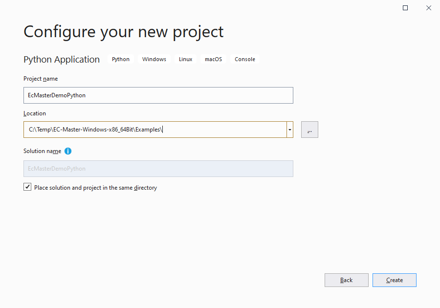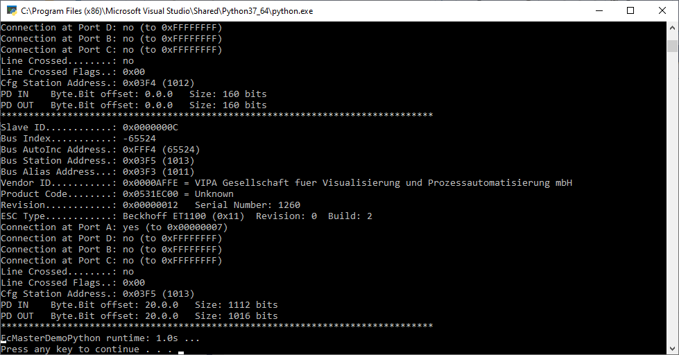 EcDemoApp.pyand the following lines to set environment: import os import sys INSTALLDIR = "C:/Temp/EC-Master-Windows-x86_64Bit/" os.environ["PATH"] += os.pathsep + INSTALLDIR + "Bin/Windows/x64" sys.path.append(INSTALLDIR + "Sources/EcWrapperPython") sys.path.append(INSTALLDIR + "Examples/EcMasterDemoPython")