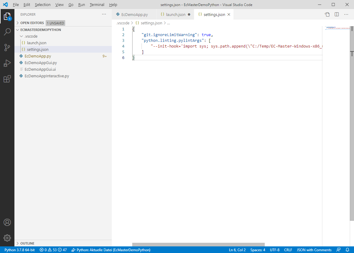 settings.json: { "git.ignoreLimitWarning": true, "python.linting.pylintArgs": [ "--init-hook='import sys; sys.path.append(\"C:/Temp/EC-Master-Windows-x86_64Bit/Sources/EcWrapperPython\")'" ] }