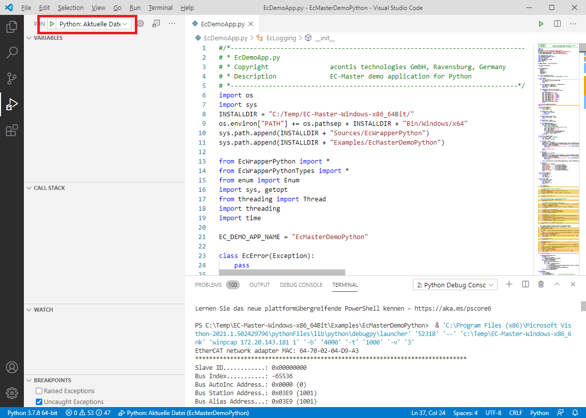 Examples/EcMasterDemoPythonand configure thelaunch.json: { "version": "0.2.0", "configurations": [ { "name": "Python: Aktuelle Datei", "type": "python", "request": "launch", "program": "${file}", "console": "integratedTerminal", "cwd": "", "args" : [ "--mode", "1", "-f", "ENI.xml", "--link", "winpcap 127.0.0.1 1", "-b", "4000", "-t", "1000", "-v", "3", ], "env": {"PYTHONPATH": "${workspaceRoot}"} } ] }