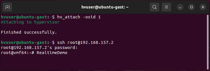 To verify whether the installation was successful, you can invoke the driver with the command hv_attach -osid <OSID>. The needed OSID was set with export rtosOsId=<OSID> in guest_config.sh when installing the Ubuntu guest. If hv_attach responds with ‘Finished successfully’, it indicates that the driver was correctly loaded and a connection was successfully established.