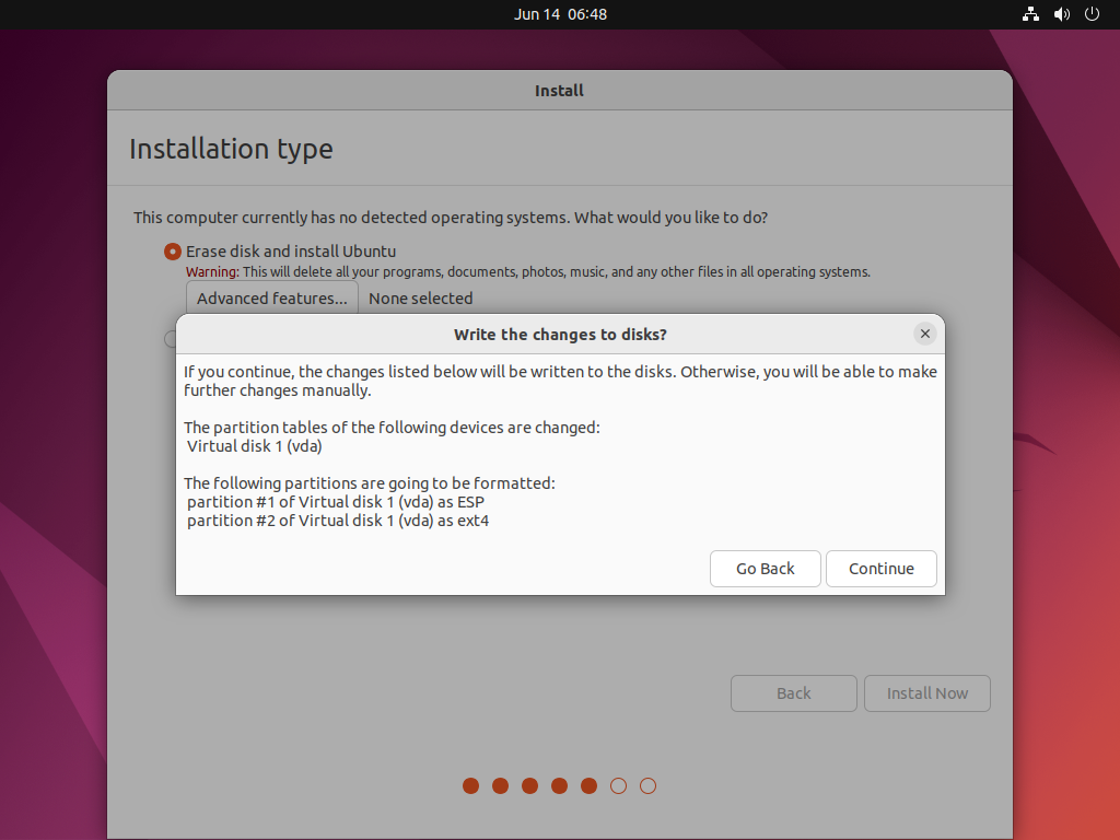 Erase disk and install Ubuntuat installation type page.Confirm
