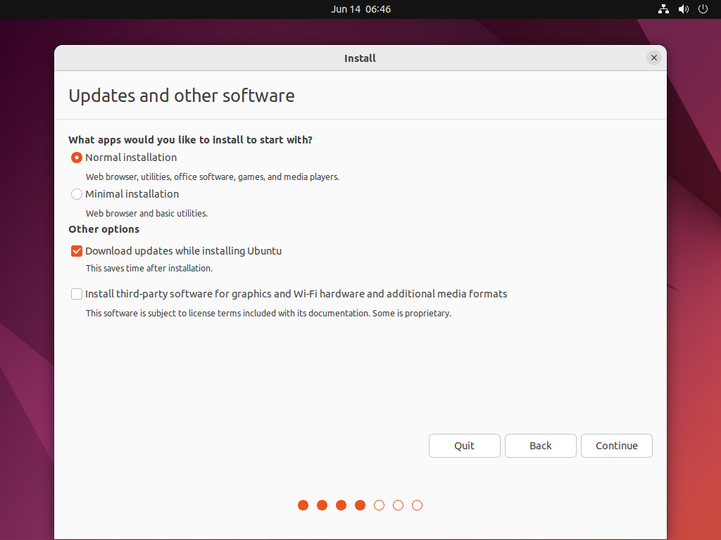 Updates and other software (default state) –> Continue