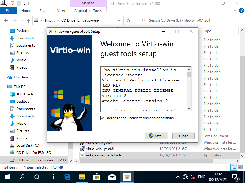 The installation file is located in CD Drive (E:) virtio-win-0.1.266: virtio-win-guest-tools. Select and start to install these tools. In case a message box appears to confirm driver installation, please confirm install the driver(s).