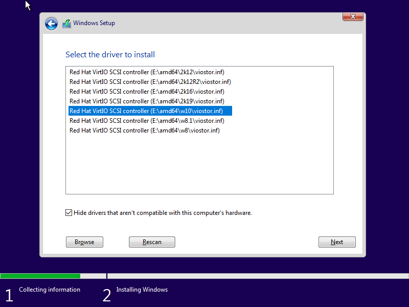 Click on Load Driver and browse to the CD Drive with the virtio drivers. Select the appropriate driver in the respective folder (e.g. Windows 10: \viostor\w10\amd64 Windows 11: \viostor\w11\amd64).